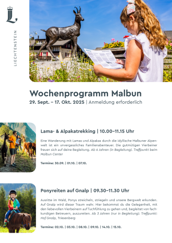 In Liechtenstein is de herfst een belevenis voor het hele gezin: van 29 september tot 17 oktober zorgt het herfstweekprogramma in de bergregio voor onvergetelijke vakantiemomenten. Met lama- en alpacatochten, begeleide e-biketochten en ponyritjes staat je elke dag een avontuur te wachten.