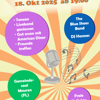 Zin in een avond in de stijl van de jaren 50? Op 18 oktober 2025 wacht je een sfeervol rock-'n-rollfeest in gemeenschapshuis Mauren . De live band "The Blue Shoes Band" en DJ Hannes zorgen voor authentiek geluid en de beste dansstemming. Passend bij het thema serveert de1950 American Diner" ter plaatse heerlijk eten.
