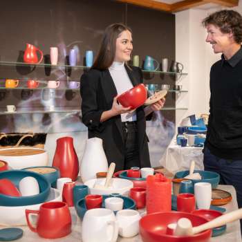 Terwijl je geniet van de beste koffie die in Liechtenstein wordt gebrand en andere regionale dranken en producten, kun je door de ramen naar de productiefaciliteiten kijken en bijvoorbeeld zien hoe het kopje waaruit je het mineraalwater drinkt wordt gemaakt of hoe de keramiekschilders "hun kwasten hanteren".