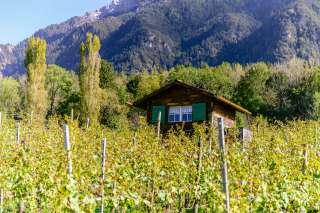 Kleine hut met groene luiken midden in een herfstige wijngaard tegen een alpine achtergrond