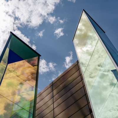 De glazen sculpturen "Light Prisms" weerspiegelen de hele omgeving, wat resulteert in veranderingen en brekingen.